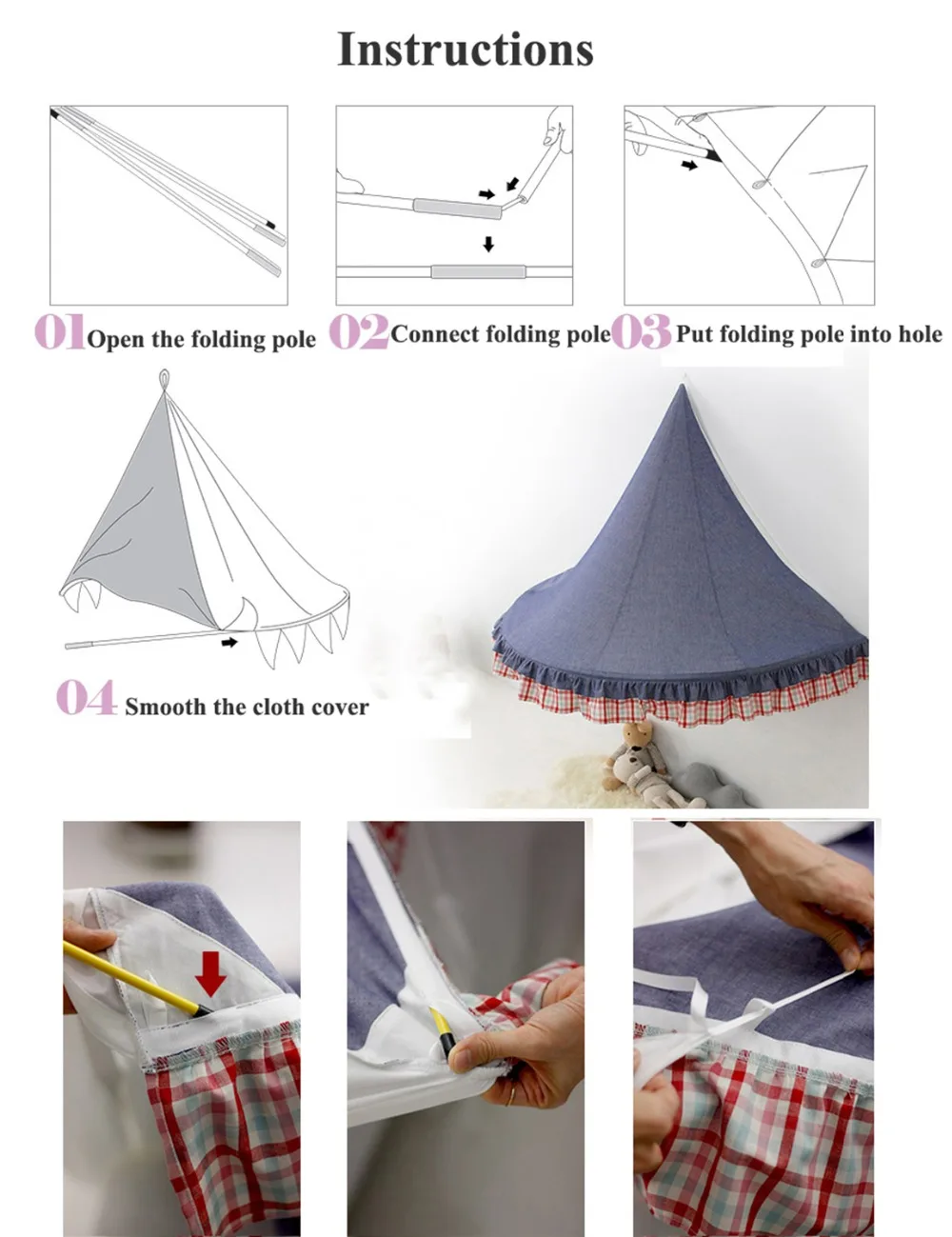 3.Product including: Metal bars, Fabric cover, Stick hook, Mosquito net.(color balls are not included ,you need to buy it seperately)
